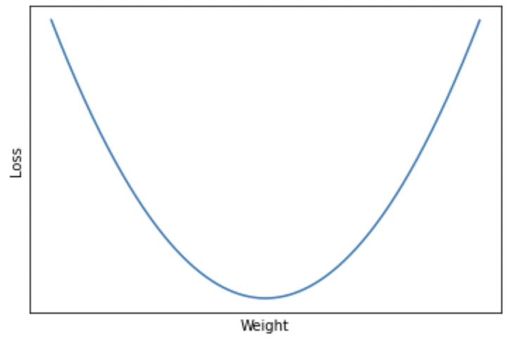 최소제곱법은 선형함수 모델의 예측값과 실제값의 오차(error)의 크기를 나타내주지만, 그 자체로는 이러한 오차를 어떻게 줄여야 하는지, 그 방법을 제시하지는 못합니다. 단지, 선형함수 모델이 얼마나 실제값에 근사한 예측을 하는지 판단하는 지표일 뿐입니다. 따라서 최소제곱법을 이용해 값을 구하는 것만으로는 충분하지 않고, 최소제곱법을 이용해 손실함수(Loss Function)을 그려주어야 합니다. 그런데 최소제곱법을 이용한 손실함수는 2차함수의 포물선 그래프로 그려지게 됩니다. 이때 x축은 가중치(Weight)를, y축은 손실(Loss)을 나타내므로, 손실을 최소로 하는 가중치 값을 찾는 것이 곧 머신러닝의 목표가 됩니다. 바로 이 가중치 값을 찾기 위해 사용되는 기법이 경사하강법(Gradient Descent)입니다.